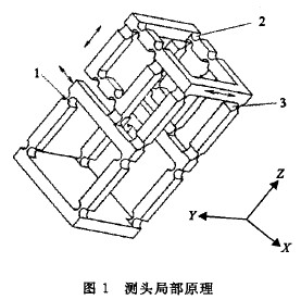 圖1為基于柔性鉸鏈的三維測頭系統(tǒng)鉸鏈部分局部原理圖,鉸鏈1為X方向平動執(zhí)行機構,鉸鏈2為 Z方向平動執(zhí)行機構,鉸鏈3為y方向平動執(zhí)行機構。由圖1可以看出,這種結構由3組相互連接的平行四邊形構成。這種相互連接的平行四邊形結構可以使測頭在進行三維測量時確保測頭部分做平行運動。