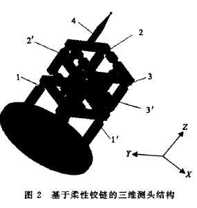 柔性鉸鏈的三維測頭總體結構如圖2所示.鉸鏈1為X方向的平動執(zhí)行機構,鉸鏈2為Z方向平動執(zhí) 行機構,鉸鏈3為y方向平動執(zhí)行機構1' 為測量X方向平動執(zhí)行機構位移的位移傳感器,2' 為測量Z方 向平動執(zhí)行機構的位移傳感器,3' 為測量y方向平動執(zhí)行機構的位移傳感器.測頭4通過螺紋連接到導向 機構上.進行三維尺寸測量時,三維測頭通過螺釘固定的三坐標測量機上,被測工件固定在工作臺上,移動測頭與被測工件待測部位接觸,被測表面的凸凹變化,會引起測頭在X、y、Z等3個方向上移動.測頭在 X、y、z等3個方向上的移動會被電感傳感器感收到,從而引起電感的變化,輸出電壓或電流信號,再經(jīng)過 濾波、放大和A/D轉(zhuǎn)換后,數(shù)據(jù)處理,可以得到測量結果。