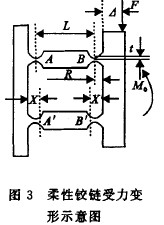 圖3是一種基于柔性鉸鏈的平行四邊形導向機構,該機構由4個柔性鉸鏈組成,在外力作用下,鉸鏈 產(chǎn)生彈性變形.由于機體上其他部分的厚度遠大于鉸鏈厚度,因此,可看作剛體.導向機構受力時,當柔性 鉸鏈變形較小時,與鉸鏈相連的工作臺近似作平移運動.