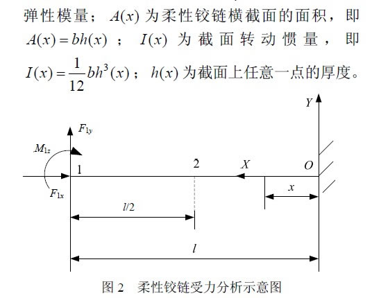 柔性鉸鏈的分析是基于小變形懸臂梁假設(shè),鉸鏈右端固定,彎曲變形是由力和彎矩產(chǎn)生的,考慮 軸向載荷的影響,而忽略剪切和扭轉(zhuǎn)的影響,受力分析如圖2所示。一般應(yīng)用單軸柔性鉸鏈在二維平面內(nèi)的運(yùn)動(dòng),對(duì)柔性鉸鏈左端施加載荷,如圖2所 示。通常用1點(diǎn)的位移來表征其柔度。
