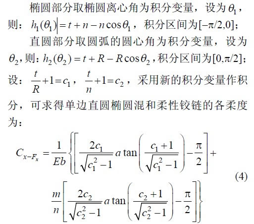 建立如圖1 所示坐標(biāo)系,則距固定端距離為x的截面處,鉸鏈厚度h(x)的表達(dá)式為: 由厚度表達(dá)式,將式(3)代入式(2)積分計(jì)算,再代入 式(1),可求得單邊直圓橢圓混和柔性鉸鏈的柔度。為了簡(jiǎn)化計(jì)算,在積分計(jì)算過程中,各部分的積分變量選取如下: