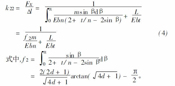 同理, 可得出拋物線和雙曲線直梁復(fù)合型柔性鉸 鏈的拉伸/ 壓縮剛度計(jì)算公式分別為