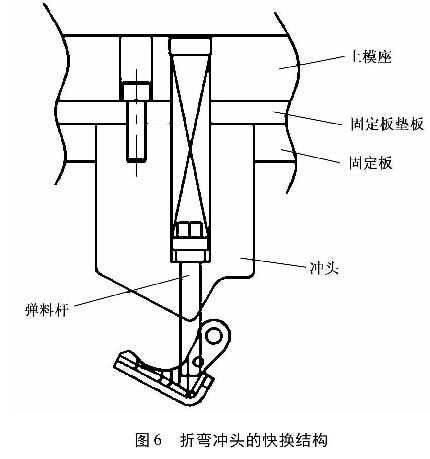 模具在工作過(guò)程中會(huì)使部分零部件磨損較嚴(yán)重,如二序成形模中的折彎沖頭(圖6),在模具設(shè)計(jì)時(shí),通常將其原來(lái)的掛臺(tái)固定方式改換成螺紋固定,使后期在不拆卸模板的情況下實(shí)現(xiàn)沖頭的拆卸和更換。此外,由于前門(mén)兩側(cè)的鉸鏈車身件具有對(duì)稱結(jié)構(gòu),在落料模具設(shè)計(jì)時(shí)凸凹模設(shè)計(jì)成易更換的鑲塊結(jié)構(gòu),在增加耐用性、易換性的同時(shí),可以通過(guò)更換相應(yīng)的凸凹模鑲塊加工左右門(mén)鉸鏈的車身件,使左右對(duì)稱的鉸鏈車身件共用一套落料模具,從而減少了模具開(kāi)發(fā)成本及模具加工過(guò)程中的能耗,節(jié)約了模具材料資源。