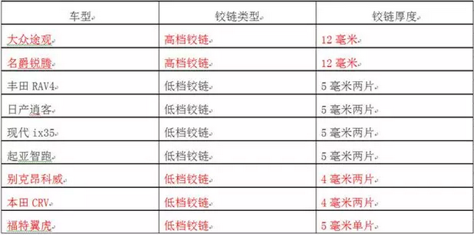 該報道內(nèi)列出,20萬元左右SUV車門鉸鏈對比表