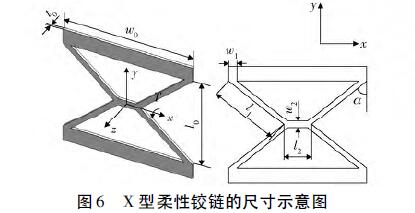 為說明Deform-X柔性鉸鏈的性能,選取相同外形的X型柔性鉸鏈,即鉸鏈寬度為w0,長度為l0,厚度為t0,鉸鏈角度α為45°,其尺寸示意如圖6所示,尺寸參數(shù)如表4所示。