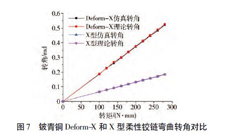 (2)通過將Deform-X柔性鉸鏈與具有相同外形尺寸X型柔性鉸鏈的對比,表明在相同轉矩作用下,Deform-X柔性鉸鏈可以實現(xiàn)更大的彎曲變形。