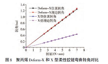 根據(jù)計算得到的數(shù)據(jù)可以繪制出Deform-X柔性鉸鏈和X型柔性鉸鏈彎曲轉角對比變化趨勢如圖7所示,同理可以得到鉸鏈材料為聚丙烯時Deform-X柔性鉸鏈和X型柔性鉸鏈彎曲仿真轉角對比變化趨勢如圖8所示。從圖中可以看出,相同材料和外形尺寸的Deform-X柔性鉸鏈和X型柔性鉸鏈的彎曲性能差異很大,在相同轉矩作用下,Deform-X柔性鉸鏈的彎曲變形轉角約為X型柔性鉸鏈的3倍,即Deform-X柔性鉸鏈可以在較小的轉矩作用下產生較大的彎曲變形,其彎曲性能得到很大提升。