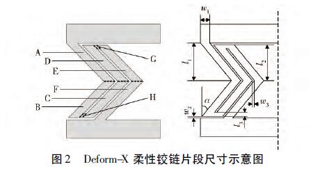 由于Deform-X柔性鉸鏈關于y軸對稱,取鉸鏈1/2作為研究對象。根據(jù)產生的變形類型不同,Deform-X柔性鉸鏈中的片段可以分為彎扭耦合片段、扭轉片段。在圖2中,片段A、B、C、D、E、F均為彎扭耦合片段,片段G、H為扭轉片段,其中片段A、F的幾何尺寸相同,片段B、C、D、E的幾何尺寸相同,片段G、H幾何尺寸相同。Deform-X柔性鉸鏈的尺寸示意如圖2所示。