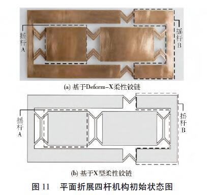 (4)設計了基于Deform-X柔性鉸鏈的平面折展四桿機構的實物模型,通過實物測試和仿真分析表明Deform-X柔性鉸鏈能夠實現(xiàn)預期的變形,機構能夠實現(xiàn)預期的運動。