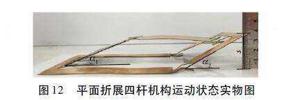 設計基于Deform-X柔性鉸鏈實例的平面折展四桿機構,材料為鈹青銅,采用線切割加工,該機構實物初始狀態(tài)如圖11a所示,機構展開狀態(tài)如圖12所示。搖桿B末端位移s為37mm時,測得角度α1為23°、α2為30°。同時,在ABAQUS中建立機構的仿真分析模型如圖13所示,仿真分析得到搖桿B末端位移s為37.87mm時角度α1為23.17°、α2為30.81°,仿真結果與實測結果基本一致,說明基于Deform-X柔性鉸鏈的四桿機構可以實現(xiàn)預期運動功能。