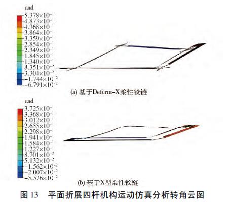 同理,在ABAQUS中建立相同外形尺寸的基于X型柔性鉸鏈平面折展四桿機構仿真模型如圖11b所示,分析結果如圖13b所示,在同樣力矩作用下,該四桿機構搖桿B末端位移s為23.40mm,角度α1為15.21°、α2為19.29°,因此,基于Deform-X柔性鉸鏈的平面折展四桿機構變形性能優(yōu)于基于X型柔性鉸鏈的平面折展四桿機構。