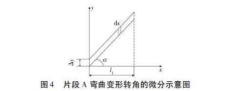 對于彎扭耦合片段等效剛度的求解,可用微積分的思想分別求解彎曲等效剛度和扭轉等效剛度,再將其進行耦合,即可得到彎扭耦合片段的等效剛度。選取片段A計算其等效剛度,設材料的彈性模量為E,剪切模量為G,泊松比為υ。計算彎曲剛度,設片段A在轉矩T作用下彎曲變形轉角為θB,其微分示意如圖4所示。公式推導過程為