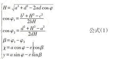 機(jī)構(gòu)的運動過程主要由兩部分組成,即滑塊的移動和曲柄的轉(zhuǎn)動。設(shè)曲柄搖桿的四個桿長依次為a,b,c,d,BE長為e。以A為坐標(biāo)原點,AD為x軸建立直角坐標(biāo)系。如圖2示,點E坐標(biāo)(x,y)與各桿長滿足如下幾何關(guān)系: