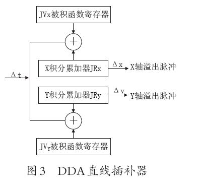 如圖3所示[7,8],一個直線插補(bǔ)器由兩個數(shù)字積分器組成,每個積分器又包括一個被積函數(shù)寄存器和一個累加器。終點的坐標(biāo)值存放在被積函數(shù)寄存器里,每給出一個插補(bǔ)脈沖各自的累加器就累加一次,當(dāng)累加的值大于累加器的容量則溢出,同時控制器發(fā)出控制指令驅(qū)動相應(yīng)的軸移動一個脈沖當(dāng)量[9]。