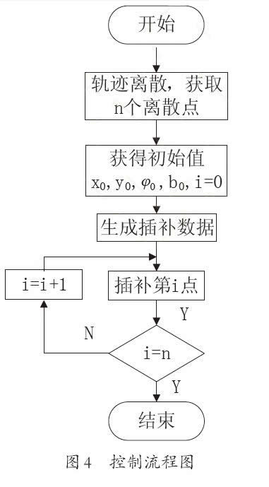 圖4是總體的控制方案流程。用Matlab處理預(yù)定軌跡獲取離散點,獲取初始值。計算出插補(bǔ)過程中連桿所有步長△bi,依次插補(bǔ)直到終點結(jié)束。